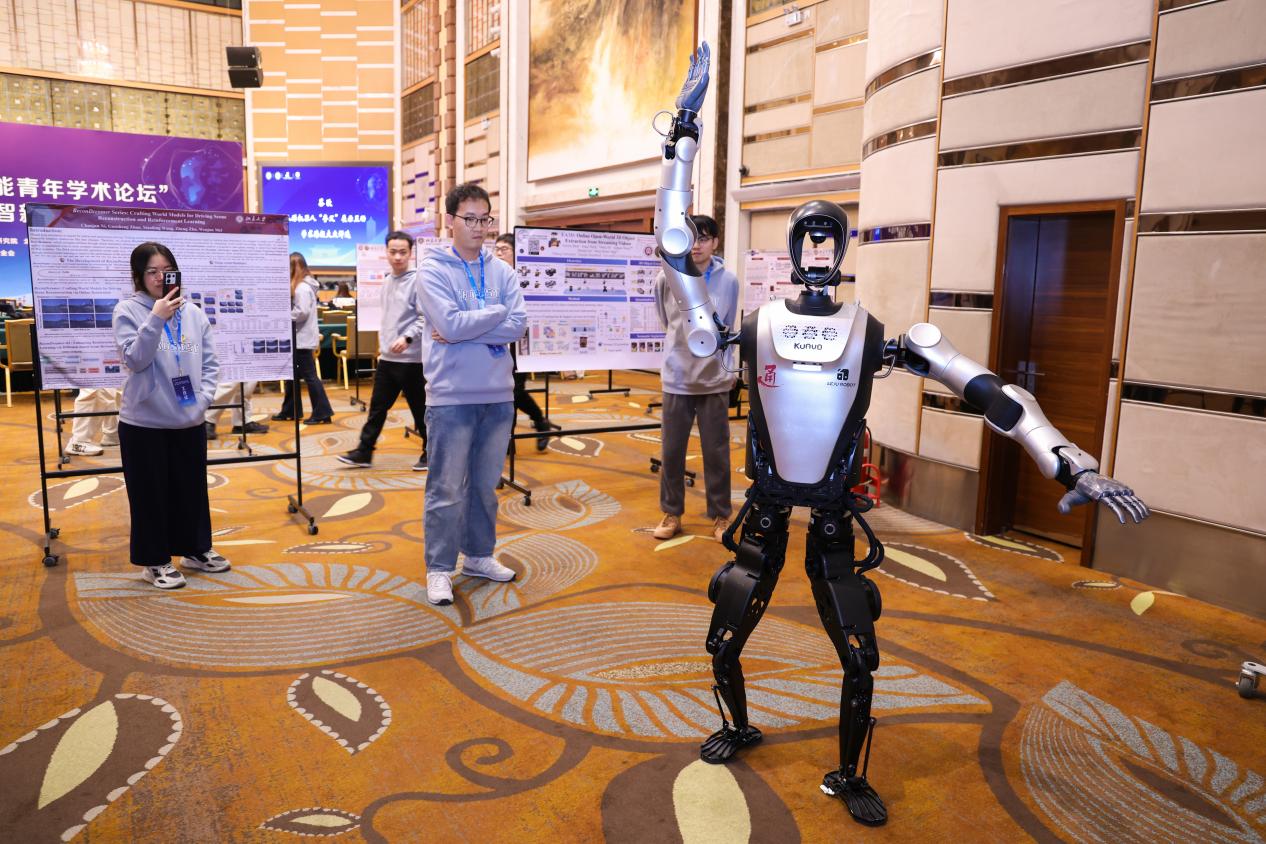 论坛还设置了学术海报展示与大众投票环节。由北京通用人工智能研究院与乐聚机器人联合研发的全尺寸人形机器人“夸父”也在现场亮相,其灵活的动作和智能交互引发现场阵阵赞叹,生动诠释了科技创新的魅力。
