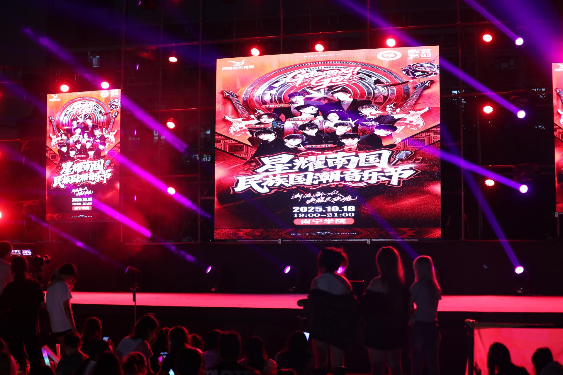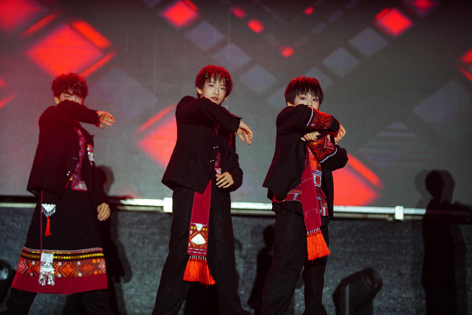 民族国潮音乐节是整场活动的高潮,三大篇章层层递进,用音乐与舞台艺术诠释非遗文化的传承脉络。第一篇章“非遗・源” 以大型综合歌舞剧为载体,原生态民歌的清亮旋律、壮族天琴弹唱的悠扬曲调、原生态民族舞蹈的灵动身姿,搭配身着壮锦盛装的演员走秀——服饰上的 “万字纹”“水波纹” 在灯光下熠熠生辉,仿佛将观众带回民族文化诞生的源头,沉浸式感受传统文化的厚重。第二篇章 “非遗・承” 聚焦青春力量,南国少年团带来量身打造的国潮表演:唱跳曲目融入壮族元素的欢快旋律,说唱歌词讲述非遗传承的当代故事,年轻演员们充满活力的演绎,展现出青少年对民族文化的创新理解,让传统与青春碰撞出别样火花。第三篇章“非遗・燃” 邀请无限活力组合等广西本土知名歌手与音乐组合登台,他们将壮族山歌的高亢曲调与现代电子音乐的强烈节奏相结合,传统歌词经潮流编曲后,既保留民族韵味,又充满时尚感,熟悉的旋律瞬间点燃现场,台下观众跟着节奏挥舞手臂,形成热烈的互动氛围。