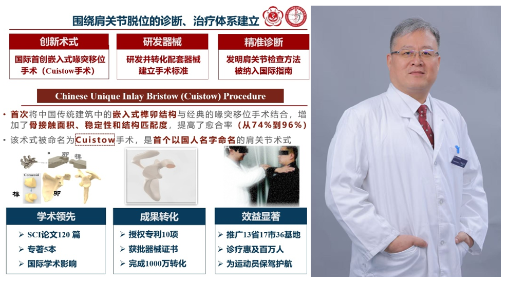 肩关节脱位是最常见的运动损伤之一,一旦复发,只能手术。崔国庆团队历经20余年研发,建立了以肩关节脱位术式创新、配套器械开发、精准肩关节查体诊断为核心的全方位诊疗体系,解决了传统手术复发率高、并发症多、骨愈合率低三大难点。主要创新成果包括: